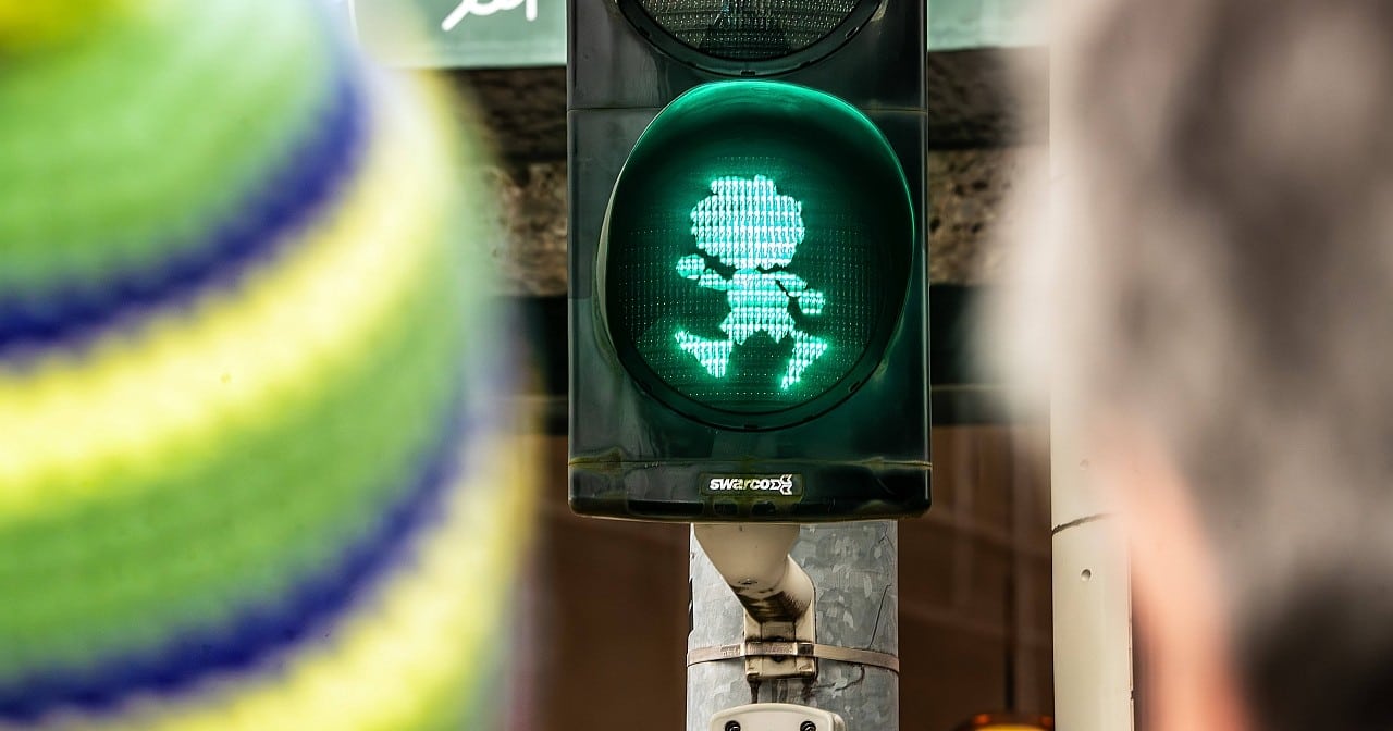 Red means stop, green means go—that’s a rule even small children learn, and the rule isn’t being questioned. What has changed, however, is partly the faces on the traffic lights. In Nuremberg, Dürer’s famous rabbit has started hopping whenever pedestrians get the green light. In Deggendorf, at a pedestrian signal the Knödel-thrower is winding up for a throw, and in Hof the cult figure “Wärschtlamo” is set to grace the signals on a second attempt soon.